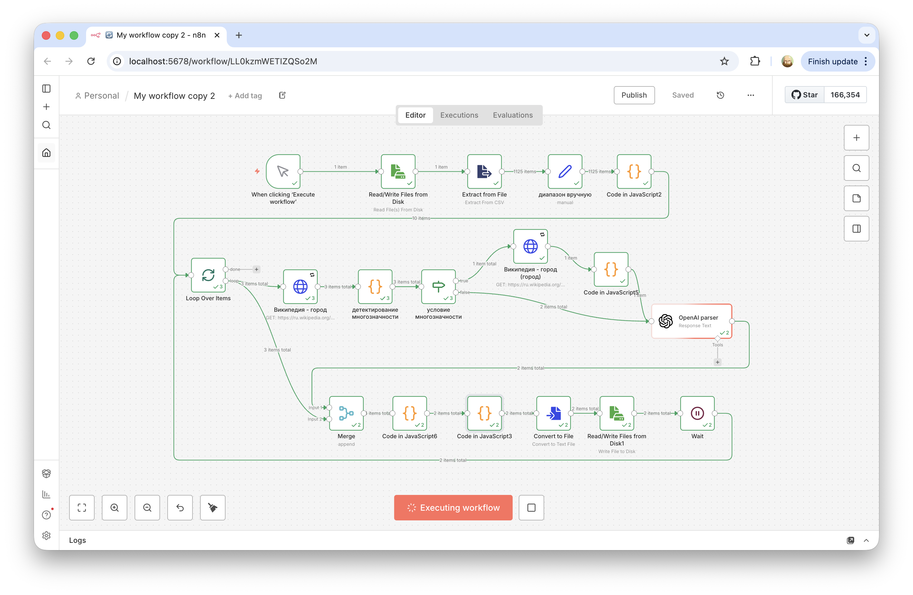 The third approach was an n8n workflow. The input was a list of all Russian cities, and for each city the workflow did the following: