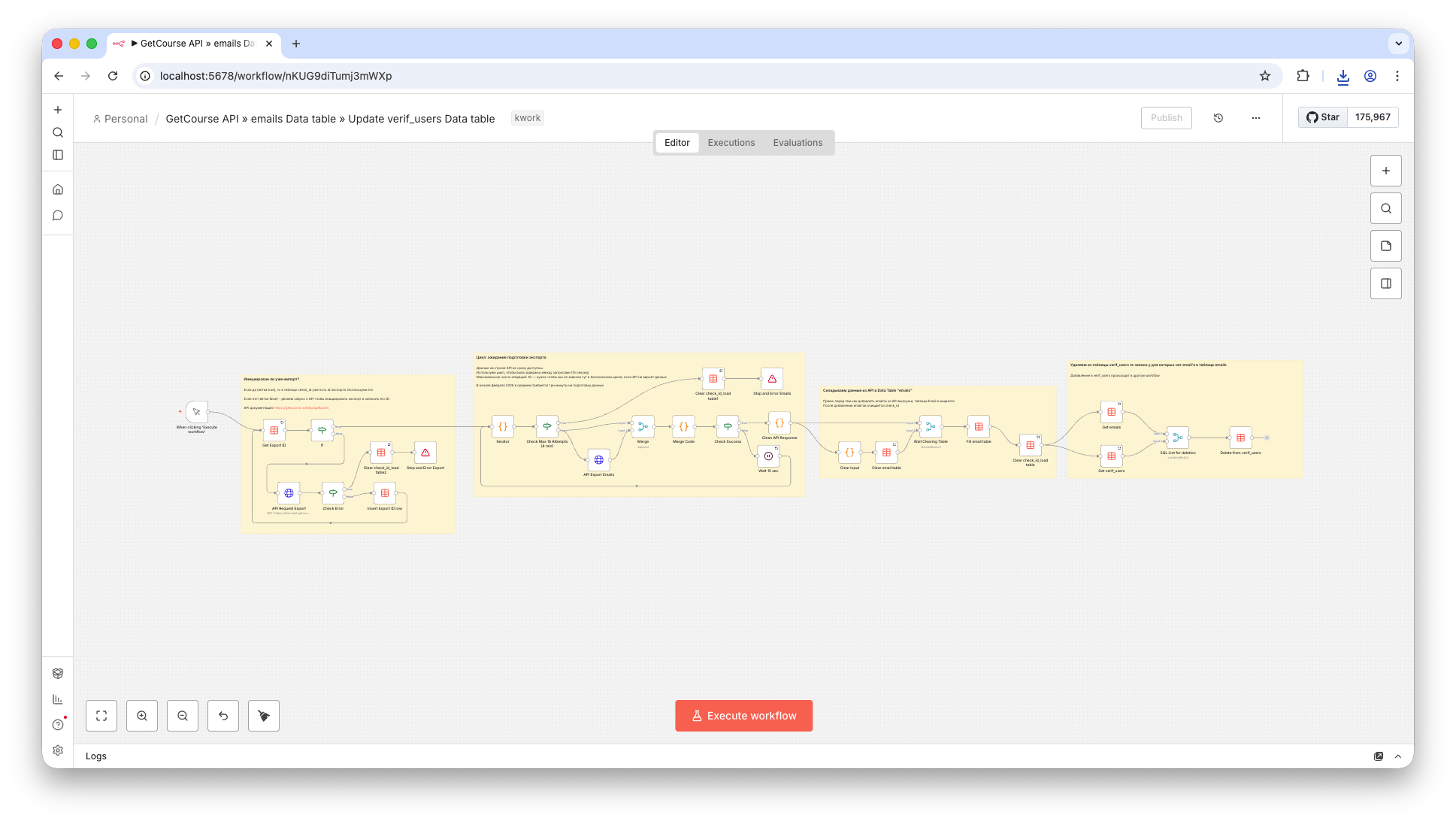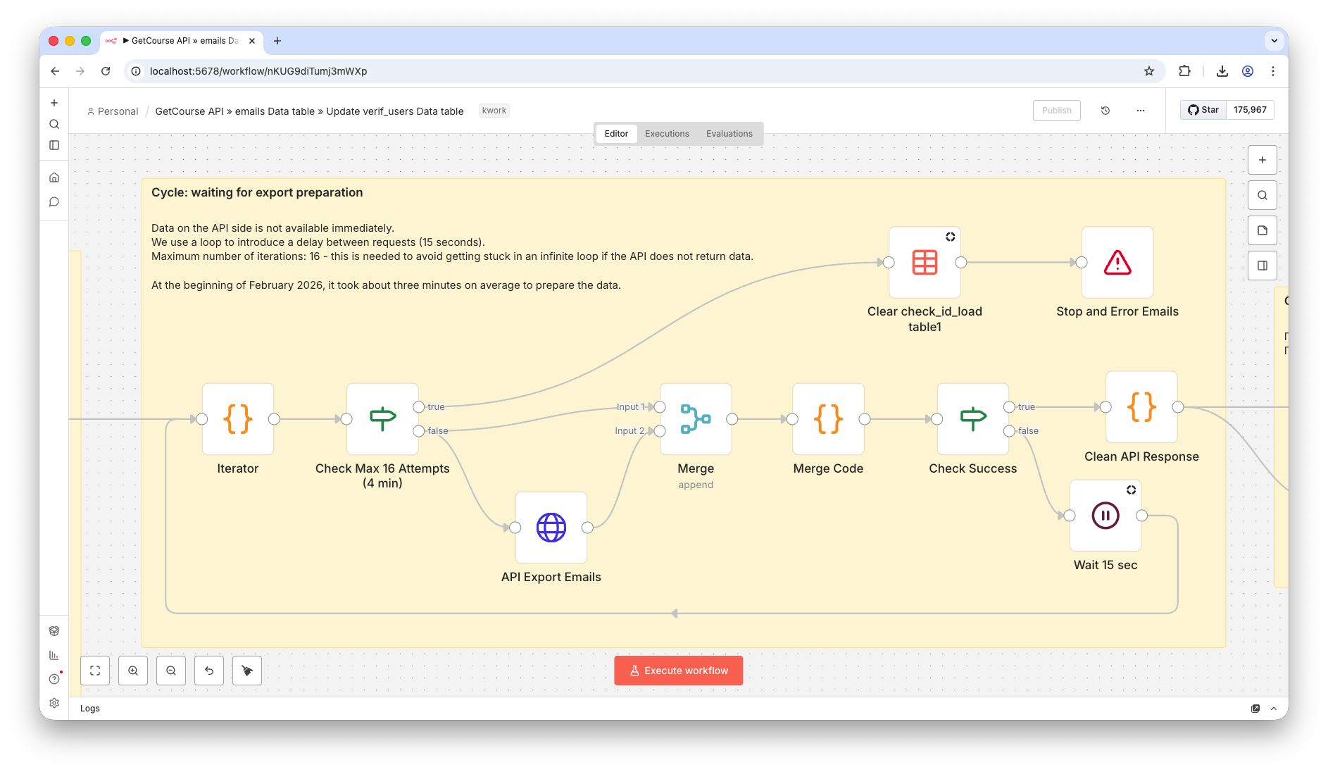 The result was a more resilient n8n process with protection against overlapping runs, waiting for export readiness on the external API side, rate-limit handling, and a safer data update strategy.